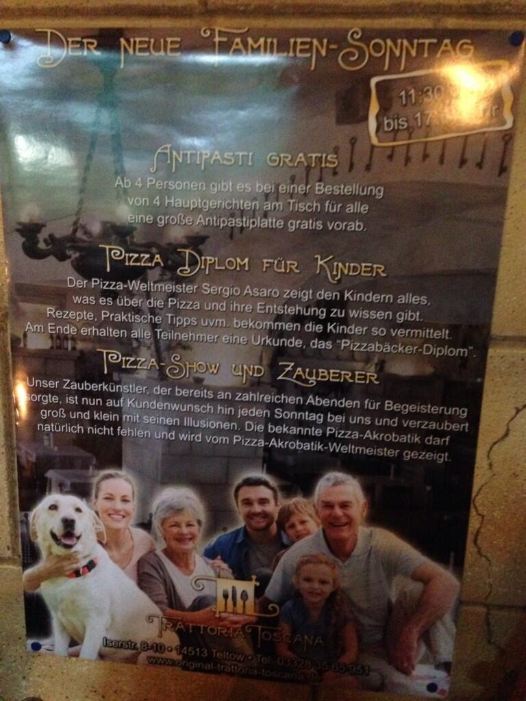 In Teltow hat ein italienisches Restaurant "TRATTORIA TOSCANA" seit ca. einem Jahr in der Iserstraße neu aufgemacht. Das Essen ist lecker, das italienische Flair in der Ausstattung und in dem Programmen ist außergewöhnlich gut!!